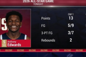 体育资讯2月16日讯 NBA全明星正赛循环赛2场战罢,美国新星队目前1胜1负。