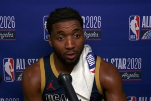 体育资讯2月16日讯 NBA全明星正赛冠军赛,美国星条队21-47不敌美国新星队,赛后,多诺万·米切尔接受了记者采访。