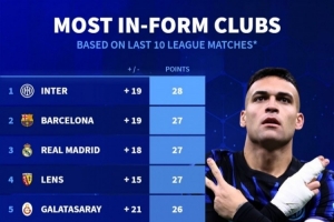 体育资讯2月16日讯 德国转会市场列出了前10联赛近10轮拿分排名,国米拿到28分居首,巴萨、皇马、朗斯拿到27分。