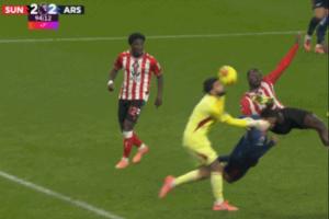 本赛季英超第11轮,阿森纳客场2-2遭桑德兰绝平。补时阶段,桑德兰高球打进禁区,拉亚出击与加布相撞,布罗比趁乱将球打进。