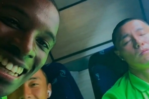 法比奥偷拍了众多队友在大巴车上熟睡的画面,他还配文写道: