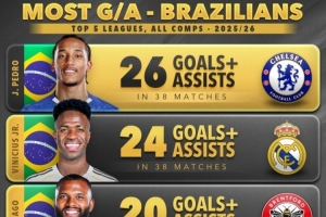 体育资讯3月5日讯 Score90统计了本赛季五大联赛巴西球员参与进球数量,并列出榜单,若昂·佩德罗参与26球居首,维尼修斯参与24球次席。