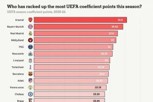 欧足联系数分排名:阿森纳为英超挣30.5分居首,拜仁、皇马前三