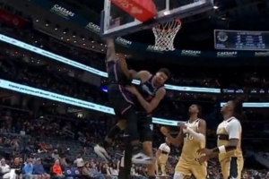 在本场比赛中,阿德巴约在一次进攻中直接隔着队友韦尔完成了一次石破天惊的补扣。