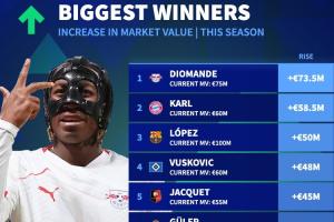 1-扬·迪奥曼德(RB莱比锡),+7350万欧,现身价7500万欧;