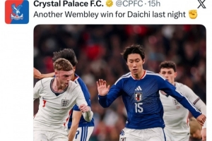 水晶宫官推也晒出镰田大地的比赛照,并配文写道:“昨晚大地再一次在温布利取得比赛胜利!”