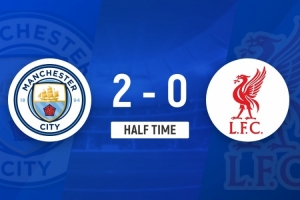 伤停补时2分钟。上半场比赛结束,曼城2-0利物浦。