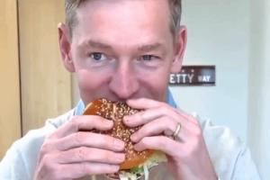 面对网友调侃他吃汉堡像在“受刑”,Kempczinski 解释那只是童年习惯。“我妈家教很严,从小就教育我:嘴里有东西的时候不要说话。”他坦言,“视频里我确实该豁出去了,嘴里塞满东西也要说话。”