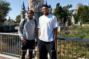 体育资讯2月11日讯 雄鹿官方晒图,字母哥和托里恩·普林斯在奥兰多迪士尼游玩。