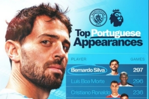 体育资讯4月12日讯 本轮英超将迎来焦点战曼城对阵切尔西,B席本场首发出场,这是他第297次英超出场,创造了葡萄牙球员在该项赛事历史纪录,以下为具体榜单: