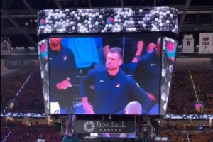 赛前介绍环节,球迷给马刺旧将、开拓者主教练斯普利特送上欢呼。