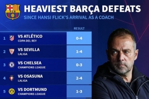 体育资讯2月13日讯 巴萨在本轮国王杯半决赛首回合客场0-4惨败马竞,数据统计显示这也是巴萨在弗里克时代最大比分失利。